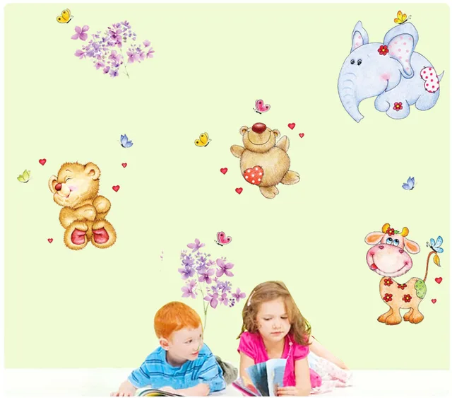 Kartun Lucu Gajah Beruang Rusa Hewan Bunga Wall Stiker Kids Room | Download Gambar